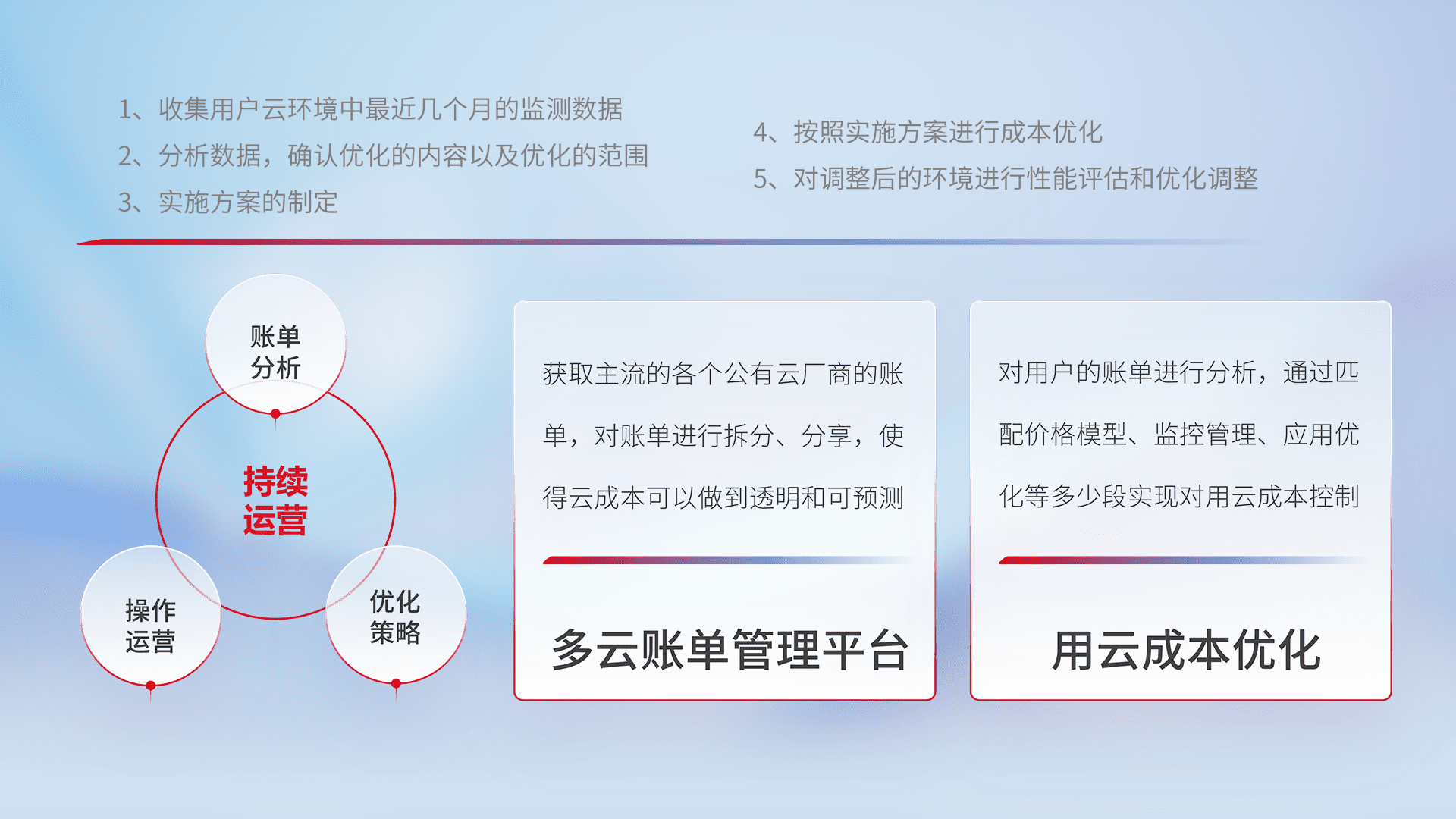 通过多云纳管,,,以统一的资源数据模型把客户的云资源进行抽象和封装,,,,进而实现对多云资源的统一操作,,,保障云资源管理的可靠性、、、、稳定性与可用性。。。量身定制化运维内容,,,配置、、、开发运维、、、补丁管理、、备份、、监控、、、认证和访问管理、、审计和日常巡检等,,,,保障在用云过程中的可靠度,,稳定度以及高可用率。。